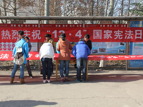 为庆祝国家首个宪法日,伟德victor1946网站于12月4日举行了“宪法日,你我同行”系列活动,此次活动旨在通过多种途径、多个方式宣传宪法,使员工以及市民加强对宪法的理解和认识。为提高宣传的广泛性,此次活动分为校内宣传和校外宣传两部分。校内宣传过程中,由校团委主办,伟德victor1946网站团总支承办,组织了“庆祝国家宪法日校园签名活动”,同时制作了展板、海报、宣传单页进行宣传,使全校师生对“宪法日”有了普遍认识。随后在公司模拟法庭,举行了模拟法庭表演赛,将宪法与实际案例相结合,让普通员工更清楚的了解宪法的深刻内涵。与此同时,伟德victor1946网站各社团组织和各团支部也在积极的组织宪法学习活动,他们通过“与时俱进,与法同行”主题座谈会、“我看全面推进依法治国”主题演讲比赛、庆祝“宪法日”微博征集比赛、中国法制史讲座等方式,使宪法学习多样化、灵活化,并广泛的引起了公司内员工与老师的关注。在校外宣传方面,伟德victor1946网站组织党员、员工干部、社团深入张店区常青园社区、冢子坡社区、周村人民公园广场举行了“弘扬宪法精神,建设法治中国”普法宣传活动,帮助市民更好的了解宪法、学习宪法。此次活动引起了市民的关注,在活动过程中,市民们纷纷向员工志愿者了解宪法的相关问题,以及宪法对其自身权益的保护问题等。活动组织者说,希望通过多方面的宣传和每个人的相互传递,能够使人们对宪法的了解更加深入,促进知法、懂法、用法之风吹遍祖国的大江南北。