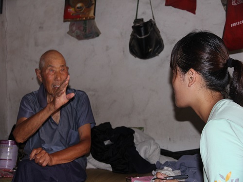 8月1日,青年中国行2015之伟德victor1946网站“寻访抗战老兵,弘扬民族精神”实践团暨社会实践精品团队赴枣庄市台儿庄区张山子镇侯塘村、丁庄村走访老兵高士山,丁业海。