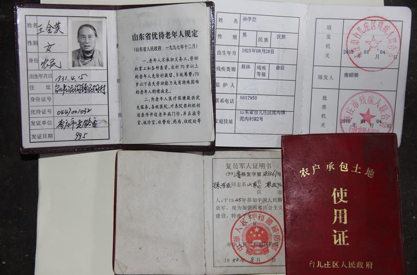季常清1945年入伍,1953年复员回乡,因为入伍时个子小,扛不动枪,所以开始在一个工厂,主要负责前线部队的后勤工作。季常清参加过解放战争,据老人回忆,解放战争时期,在一次战斗中,我军把敌人的电线切断,敌人没办法通风报信,敌人没有外援,我军取得了胜利。1947年,季常清南下到上海,成为维持当地社会治安队伍的排长,负责上海一个区域的治安。记者现在还记得老人铿锵有力地和我们说道:“上海聚集了世界各地的人,当兵的站岗,不能越岗,不能丢中国人的脸。”深深感动了随行的记者。老人现在住在东黄庄村里,生活悠闲,能够自理,儿女孝顺,平时在孙子开的废品回收站里看门,喜欢出去走走,赶集和人聊聊天,老人身体较为硬朗,精神矍铄。孙学臣1945年入伍,我们到泥沟村采访时,得知老人现住在台儿庄区马兰镇的一个敬老院里,有专人看护。