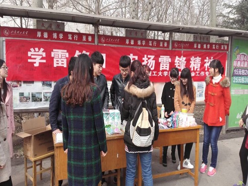 早上,15级全体员工前往敬老院陪老人聊天,为老人表演节目,听老人讲述他们的艰辛岁月,并在工作人员的指导下为敬老院打扫卫生。14级员工在校内开展一系列志愿活动:爱心商品销售为持有绿卡的同学提供福利;帮助宿舍管理人员打扫宿舍楼,减轻他们的负担;与图书馆工作人员共同整理图书,使同学们提供更加便利的翻阅图书;扶起校园内歪倒的自行车等,同学们以实际行动表达传承雷锋精神,担当社会责任。