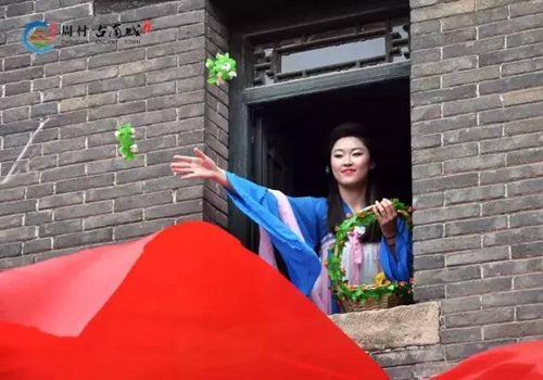 周村因商而兴、因商而城,是丝绸之路的组成部分,被誉为“丝绸之乡”、“天下第一村”、“金周村”等。据史书记载,我国最早出现的丝织中心可以追溯到2500年前左右,即春秋时代以淄博为中心的齐鲁地区。本次活动首先从周村古商城南门开始,伴随着声声锣响,扮演“蚕仙”、“蚕娘”的山理佳人们身着汉服古装从古商城大街游行,期间配合游客拍照欣赏,行至大染坊景点时鸣锣开市与蚕仙巡游环节就进入尾声。接着在“蚕仙娘娘”带领下众蚕娘开始撒花、插花来祝福蚕农蚕桑丰收,生活幸福。最后山理佳人们随着古典音乐缓缓挪步,挥动衣袖,来显示古代汉服--齐胸襦裙与曲琚深衣的风采。