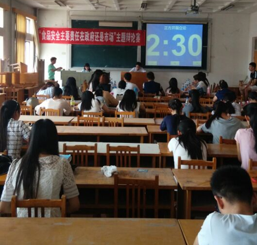 活动伊始,由行政学会会长闫永杰担任主持人,主持比赛流程及参赛规则和注意事项。首先介绍参赛双方:正方是行政1402班,所持观点是食品安全主要责任在政府;