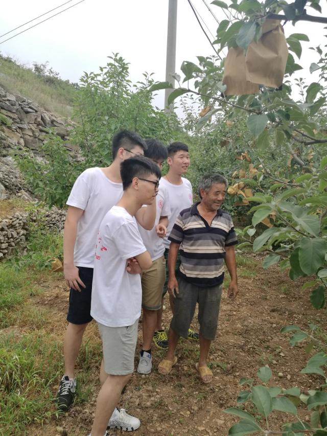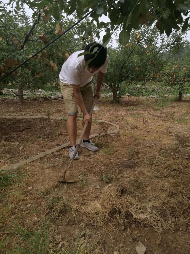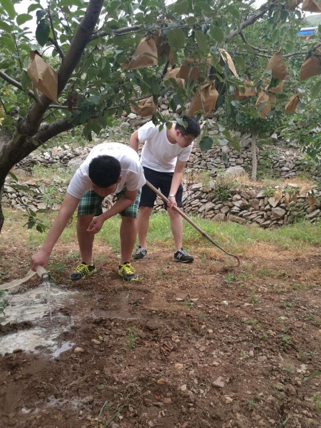 在田间,经当地果农同意后,团队的男生拿起从未触摸过的农具,与当地的农户一起感受沂源红苹果的生长。因为团队的成员大多来自城市没有接触过农业生产工具,开始的时候并不适应,在果农的悉心指导下逐渐掌握了工作的要领,把农活干的也是有模有样。从除草,到浇水,施肥,团队的男生和果农一起辛勤的劳作,但是农业劳作的辛苦渐渐地磨灭了当初工作的热情,团队成员的额头也逐渐冒出了细密的汗珠,手中的动作也逐渐慢了下来。而且在果园中由于果树的枝叶繁茂,通风条件较差,很快团队成员的衣襟就全部湿透了。但是团队成员依然没有轻言放弃,坚持帮助果农把地里的杂草清理干净,果树全部灌溉完。