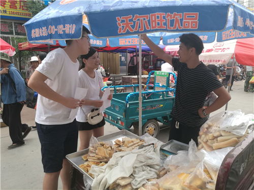 继续在集市上进行问卷调查。实践团成员来到食品区,正好遇到一个年轻人在卖自己家制作的绿豆饼,通过交流得知摊主是湖北某大学的一名大三员工,开学即将大四,自己利用假期时间帮助父母卖点东西补贴家用,这种精神领实践团成员甚是佩服。