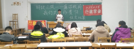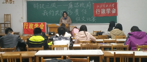 为了响应国家对加强廉洁政府建设的号召,提高老员工的社会责任感和历史使命,11月18日晚7点在3号教学楼303教室,行政学会举办了“时政之风——廉洁政府我们共同的责任”征文比赛活动。本次活动由伟德victor1946网站社团联合会主办,伟德victor1946网站行政学会承办。