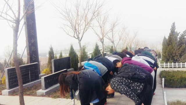 到达烈士墓,在活动策划人郭伟的主持下扫墓活动正式开始,大家纷纷排成两列长队,走向烈士墓碑前,敬献自己亲手叠的小白花,高唱国歌,庄重的三鞠躬表达了对先烈的深切哀悼和无尽的敬仰之情。