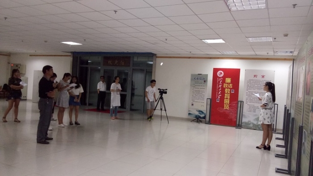 5月18日,廉政教育展厅讲解员培训选拔第一阶段的试讲在图书馆负一层举行,社团指导老师钟玉涛,校纪委领导王建利、吕乃珍以及五位讲解员参加此次活动。