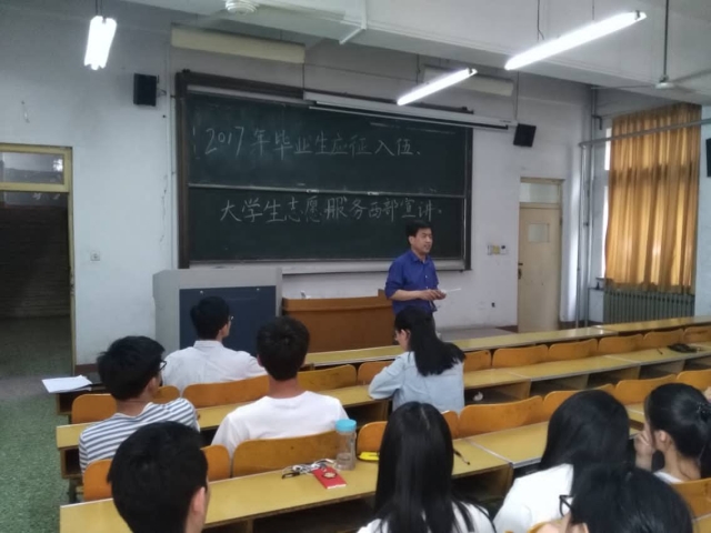 王仲孝首先为同学们解读了有关《应征入伍》的通知,从预征对象范围,预征年龄,预征条件和预征方法程序等方面进行讲解,针对毕业生入伍的优惠政策、发展环境等老员工关注问题做了解释,并从经费保障、志愿者管理、工作生活等多个方面进行详细介绍,为同学解除后顾之忧,最后王仲孝鼓励同学们参军入伍,发光发热,为国家做出贡献。在西部计划宣讲会上侯振中给大家解读了《西部计划》的有关内容,总结我们应该高度重视,精心组织。注重总结,做好宣传。他提到毕业生积极参加西部志愿活动不仅能提高实践能力和综合素质,还可以丰富人生经验,磨炼完善自我,为进一步走上工作岗位打下良好的基础。最后,王仲孝寄语毕业生们要以积极的态度迎接生活,以饱满的热情投身西部建设工作。