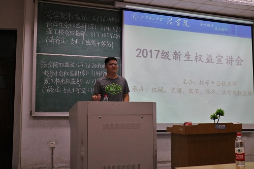 为了增强同学们的维权意识,传授正确的维权方法,2017级新生入学权益宣讲会于9月22日晚在东校区3号教学楼106和108教室同时举行。此次活动由校员工会权益部主办,机械、交通、农工、经济、伟德victor1946网站权益部承办,由校权益部部长李梦斐以及伟德victor1946网站权益部部长周珂主持演讲,各公司权益部负责人和2017届新生参加了此次宣讲会。