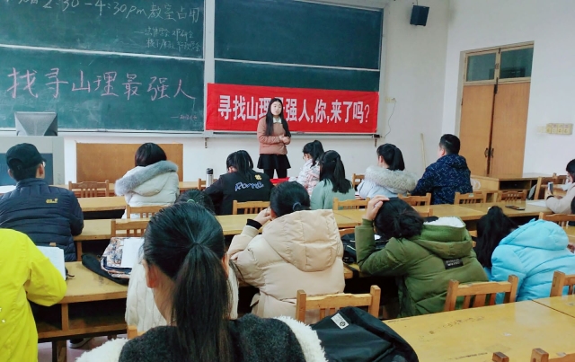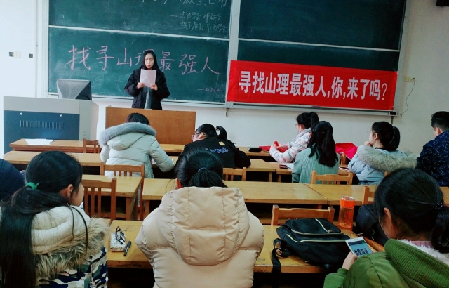 为了培养“有社会责任、有创新精神、有专门知识、有实践能力、有健康身心”的应用型高级专门人才,11月30日,由校团委,校社团联合部主办,邓小平理论研究会、法律学会、稷下廉政学社、行政学会协办的“寻找山理最强人”决赛在一号教学楼304教室顺利举行。
