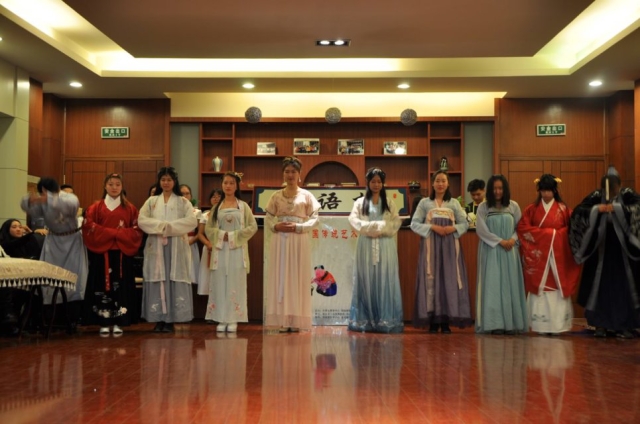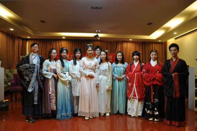 〝岂曰无衣,与子同袍〞是灵感汉服文化社的汉服理念。在活动开始时,一舞《兰陵王入阵曲》让在场的同学无不惊叹,会员们一个个都积极性很高,勇于展示自己,襦裙、袄裙、圆领袍、褙子等齐上阵,不仅展现汉服的美同时也向外国职工朋友们宣传一些中国传统文化。