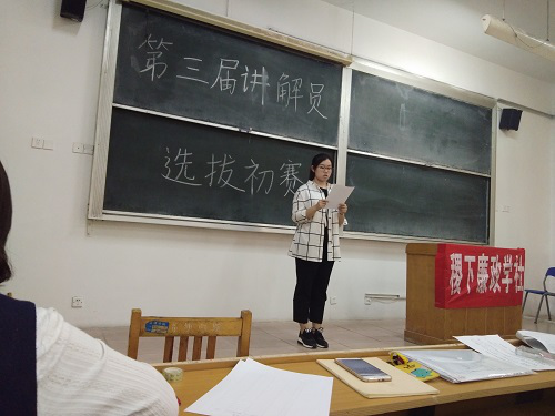 比赛伊始,稷下廉政学社会长陈君霞向参赛人员介绍了比赛规则和标准,然后参赛选手们在演讲稿中随机抽取一张,在规定练习时间过后按照签到表顺序上台演讲。1分钟的自我介绍之后,评委随机挑选段落,选手进行演讲。参赛选手们在短时间里迅速熟悉手中的演讲稿,表达流利、大方得体,在评委们面前展示自己心目中的讲解员。评委们根据选手们的表现指出他们的不足,纠正他们的发音。同时评委告诉选手们,在讲解时不仅要有控制全局的气势与自信,而且要根据讲解内容灵活地变换语气,选手们也在评委的点评中努力的改正自己。