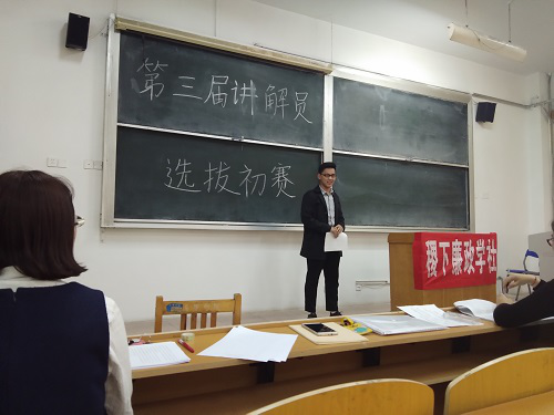 俭以养德,廉以立身。应校纪委要求,4月12日下午,第三届廉政教育展厅讲解员选拔赛初赛在西校区1号教学楼116教室举办。此次选拔赛由稷下廉政学社主办,由校广播台的卢存禹、李衍豪和廉政展厅讲解员夏学聪担任评委,稷下廉政学社指导老师、校纪委监察处副处长王建利也来到现场进行指导。
