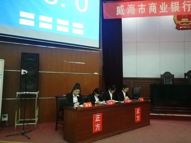 2019年3月14日,由威海市商业银行淄博支行赞助支持、伟德victor1946网站辩论协会协助举办的“威海商业银行杯金融知识辩论赛”在模拟法庭顺利举行,邀请到威海市商业银行淄博支行的郭安琪女士、李园女士,伟德victor1946网站胡安水、孙明、孟晶晶老师担任本次比赛的评委。