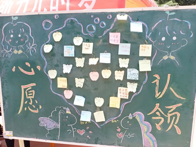 活动开始前,工作人员便在餐厅门口支起了活动棚、挂好了条幅、摆好了小黑板,并用音响播放歌曲来吸引大家的注意,同时给过路的同学发单页进行宣传。小黑板上贴满了便利贴,上面写着孩子们的心愿,有的写着雪糕、汉堡等小食品,有的写着小火车、篮球等玩具,多种多样。