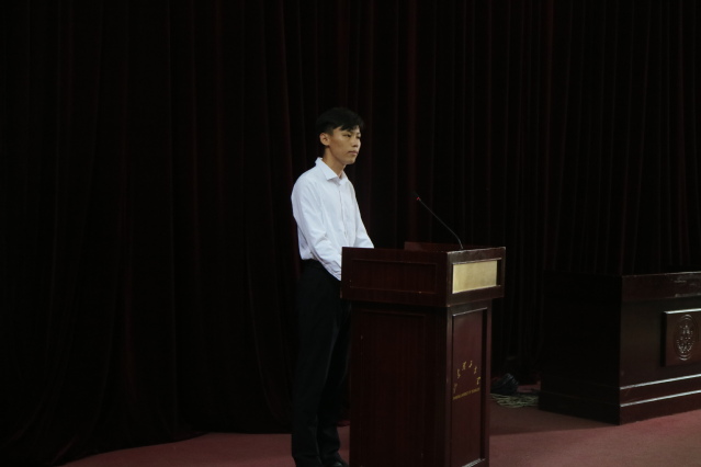 毕业生代表法本1501班刘震代表2015级全体毕业生向辛勤培育莘莘学子的母校、公司以及老师致以诚挚的感谢。他分享了大学四年的收获与感悟,真切回忆四年生活的苦乐酸甜,并表达了2015级全体毕业生奋勇向前的坚定信念和对母校真诚的祝福。