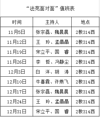 “法苑面对面”是公司为进一步拓展员工与公司之间的沟通渠道,精准做好员工教育管理服务工作,提高员工在校学习生活的幸福感和获得感,促进和谐平安校园建设而搭建的师生交流平台。每周四下午4:00—6:00,安排一名院领导、一名辅导员在2号教学楼314西接待员工来访,倾听员工意见建议。