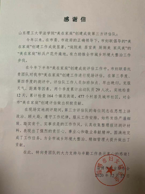 近日来,伟德victor1946网站收到了一封来自淄博市妇女联合会的感谢信,对牛喜霞老师负责、由社会工作专业陈胜、殷丽环等29名研究生和本科生组成的“美在家庭”创建成效第三方评估队的辛勤付出表示肯定,并对项目评估团队的支持与劳动表达了由衷的感谢和真诚的慰问。