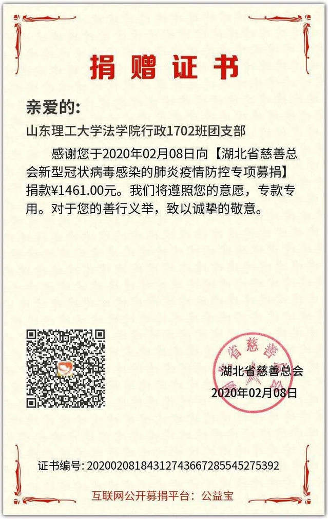 新型冠状病毒感染的肺炎疫情牵动着同学们的心,近日,伟德victor1946网站行政1702班全体成员向湖北省慈善总会“新冠状病毒疫情专项”捐款1461元。捐款当天收到了来自湖北省慈善总会颁发的电子版“捐赠证书”,湖北慈善总会将遵照团支部意愿,将捐款全部用于新冠肺炎疫情防控。