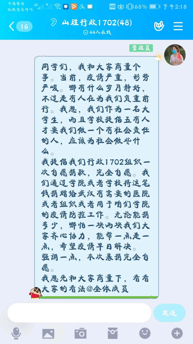 面对疫情防控的严峻形势,行政1702班班长圣金龙率先与本班委团支部进行商量,在得到全体班干部的一致同意后,在班级群里发起自愿募捐的倡议。辅导员孟晶晶老师在得知同学们集体募捐的消息之后,深受感动,也积极加入到募捐活动中。短短几个小时,便募集捐款1461元。根据同学们的意愿,将募捐所得钱款通过湖北慈善总会捐赠给湖北省疫情防控一线的医院。