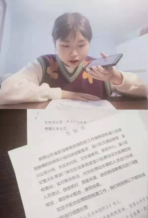 姓名:田雨班级:法本1903 服务地点:滨莱高速淄川疫情防控检查站服务事迹:录制广播