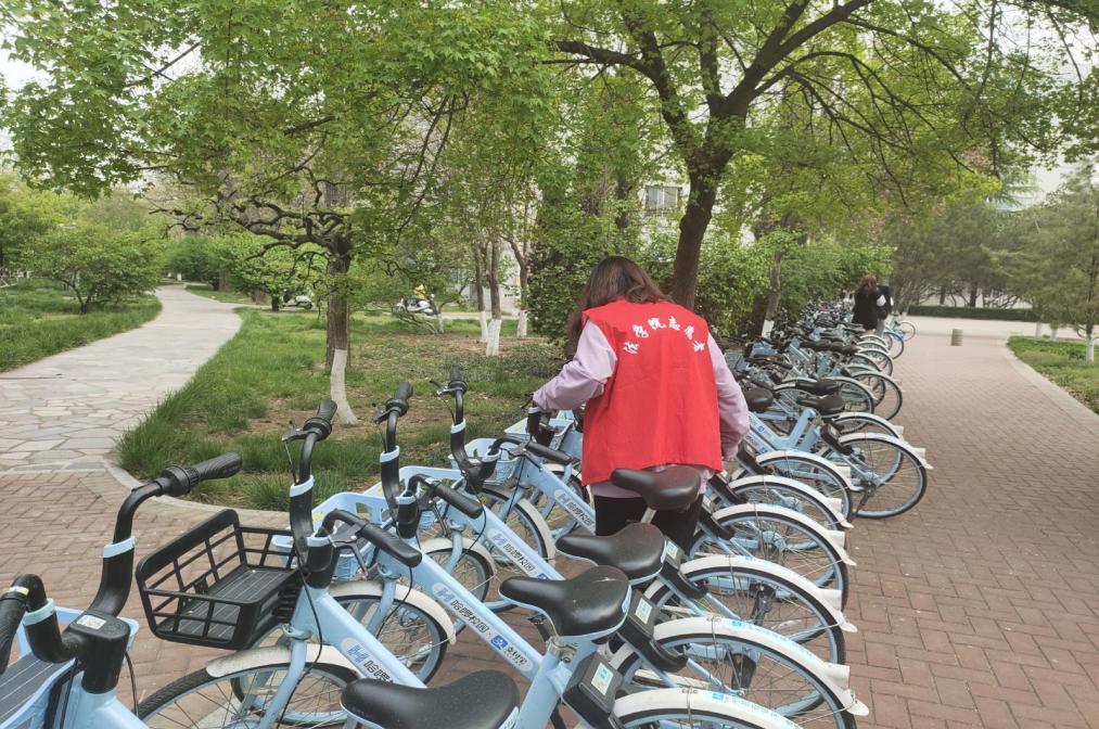 在活动开始的前一晚,负责人给全体志愿者布置分工,并向大家强调了活动注意事项,分发工作服红色马甲。活动开始后,从一号宿舍楼到二号餐厅门口,每一处单车停放点都有他们活跃的身影,原本随意停放杂乱无章的共享单车在经过整理后变得井然有序。