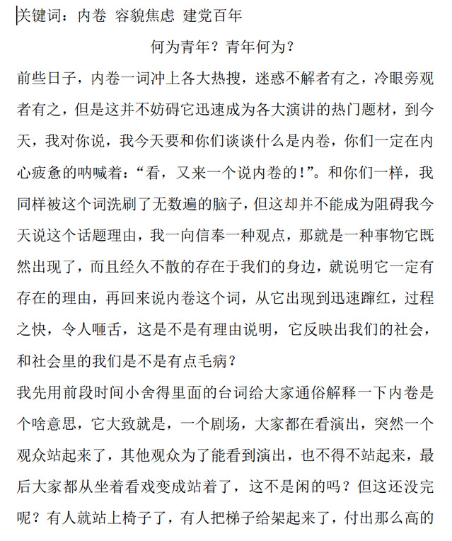 经过初赛角逐,共有九名选手进入决赛。此次活动的决赛部分分为三个环节,选手自我介绍、现场抽题准备、即兴演讲。选手们现场抽取上台顺序和演讲题目,针对“内卷”“容貌焦虑”等热点问题提出了自己的观点。评委从观点正确鲜明、论据引用恰当、与实际生活联系紧密以及选手语言表演力四个部分进行评价。经过现场评委的精心打分,最后选拔出一等奖3名,二等奖5名,三等奖7名。