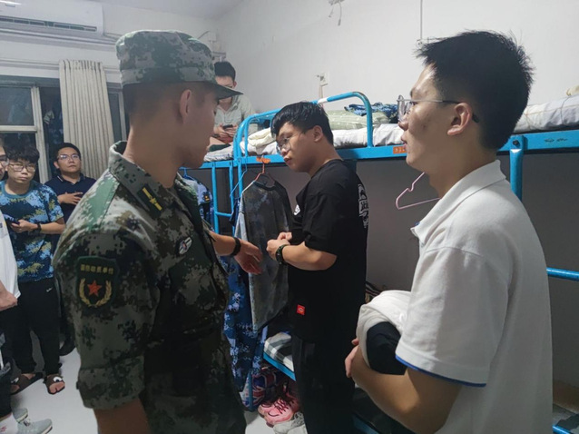 活动伊始,在国睿的带领下,各三位教官进入深入一号宿舍楼北楼新生男女生宿舍进行讲解示范,,依次检查新生内务并且对新生内务标准进行统一要求。进入宿舍后,教官开始着重对被褥的整理与叠放进行教学,在细致的讲解之后,一床蓬松的棉被就在教官的“叠、压、捋”几个动作之下,变成了四四方方的“豆腐块”,床铺顿时变得整洁有序。随后,教官对军训服装、马扎等生活物品的摆放作出明确要求。通过教官一系列的教学示范,新生宿舍一改之前的样貌,变得更加舒适、干净。