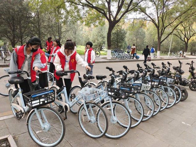 本次志愿活动分为两组,每组50人。志愿者们在第一餐厅门口集合,分别前往第三教学楼、第一餐厅门口、第三餐厅门口等活动规定区域进行单车的整理与摆放。志愿者们将道路两侧随意停放的共享单车归入停车区域并摆放整齐,并对车篮内的垃圾进行清理。活动中,其他同学们也都自觉的参与进来帮助志愿者们摆放单车,这正是社工“助人自助”理念的鲜明体现。