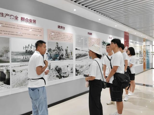 滔滔黄河,悠悠历史。实践团成员跟随讲解员参观黄河南展区历史文化展厅。文化展厅由南展由来、南展工程、担当之迁、幸福之迁和振兴之路五部分组成。建设黄河南展工程,党员群众们干劲十足,千军万马筑大堤、修涵闸、建房台,他们艰苦卓绝、坚韧不拔的奋斗精神深深地触动着实践服务队成员们。在独特的村落敞开式舞台,沉浸式观看系列情景剧《魂系黄河滩》,聆听南展区各大队支部在党的领导下勇担当、做表率,带领南展群众战天斗地、共建幸福家园的励志故事,感受南展群众前后50年2次大迁建的牺牲与不易,激发学员听党话、跟党走,识大体、顾大局的担当奋进精神。感受南展群众前后50年2次大迁建的牺牲与不易,体悟在党的领导下,扎实贯彻落实黄河流域生态保护和高质量发展国家战略的重大意义。