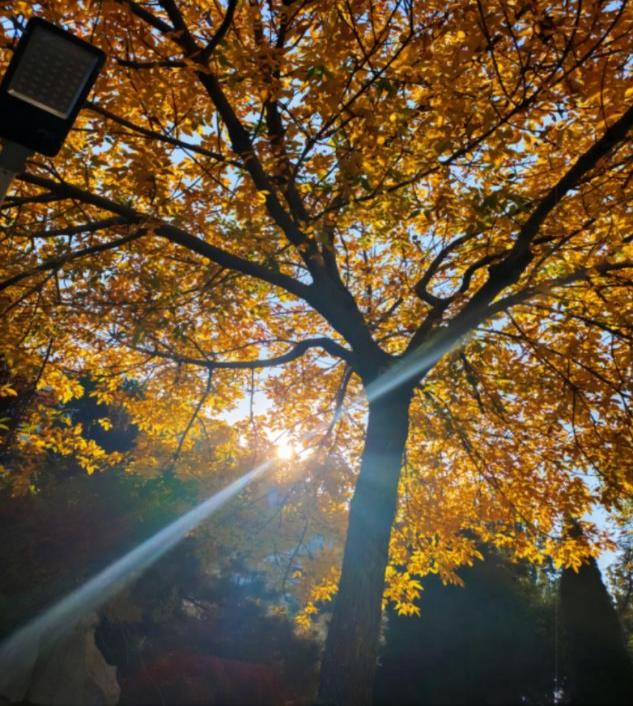 照片灵感:阳光透过发黄的树叶洒下参差斑驳的光影。风拂过,树枝上方是一片摇曳的
