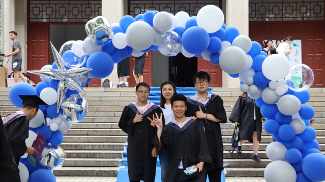 田立超、王玲、张琳、白洋、牛喜霞、徐德臣、马迎雪、崔达为毕业生们一一拨穗正冠、颁发学士学位证书,合影留念。