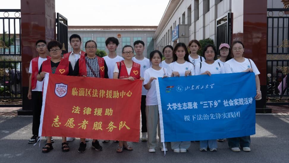 (图为伟德victor1946网站稷下法治先锋实践团与临淄区法律援助中心法律援助志愿服务队在临淄区法律援助中心门口合照)