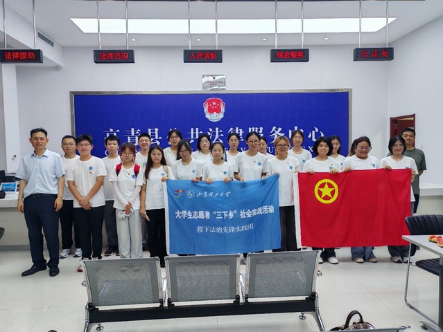 (图为实践团成员与工作人员在高青县公共法律服务中心合影)