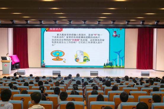 下半场课堂无缝衔接,徐欣杰以一段充满神秘感的“电学谜语”开场,瞬间点燃了孩子们探索“电的魔法世界”的热情。她从孩子们最熟悉的日常电器入手,揭秘了电热水壶如何将电能转化为热能的原理,并通过互动问答的形式,重点讲解了冰箱、空调等常用家电的安全使用知识,强调了“湿手勿碰电器”等关键安全守则。