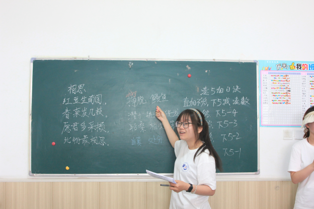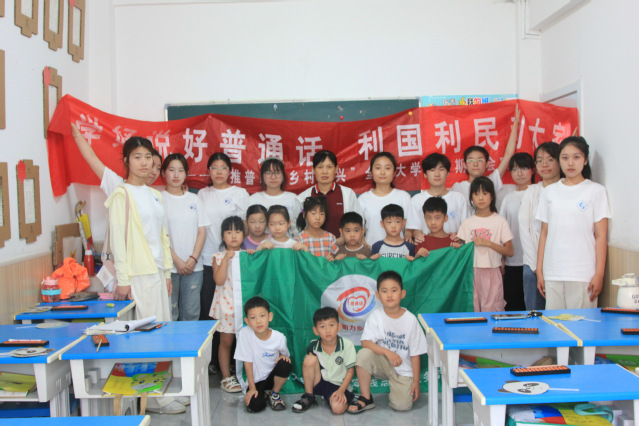 (图为实践团成员马泽慧为同学们规范字词读音)