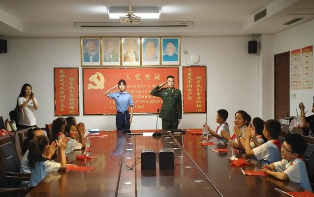 (图为两位退伍老员工向在场孩子和家长庄重敬礼)