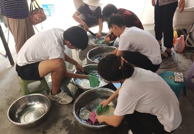午餐结束后,实践团成员们主动承担洗碗任务,分工负责餐盘冲洗、擦洗和高温消毒等工作,动作麻利细致。