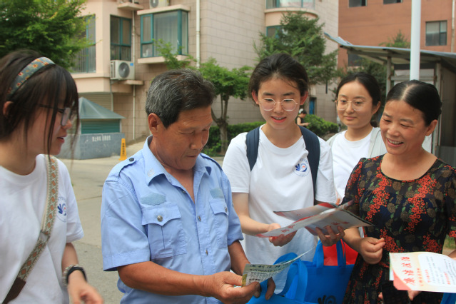(图为实践团成员向社区居民普法)
