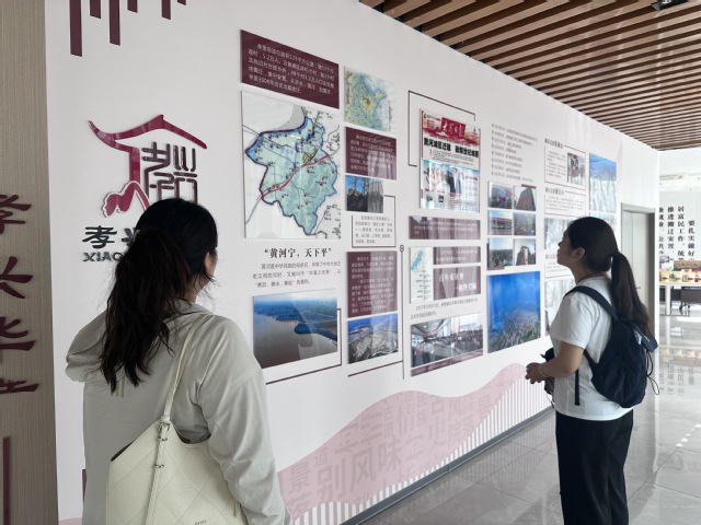 (图为实践团成员在党群服务中心黄河文化展板处参观学习)