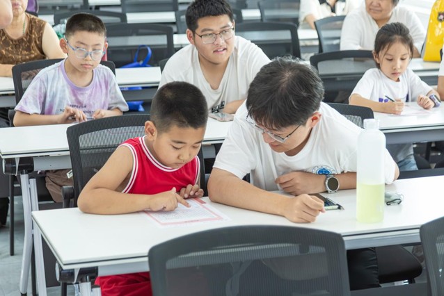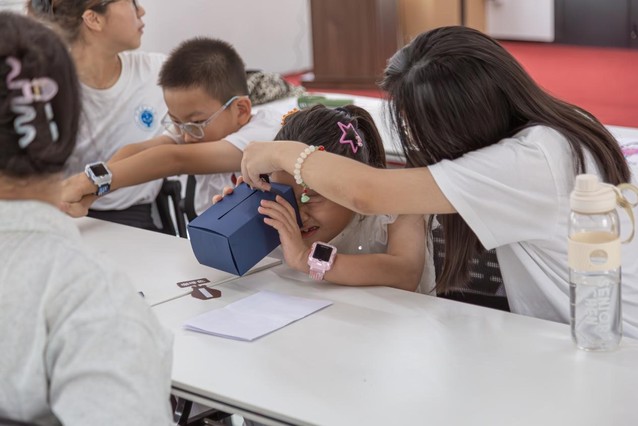 (图为实践团成员协助员工进行“舒尔特方格”游戏)