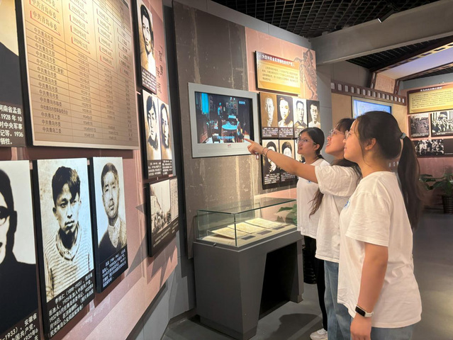 (图为实践团成员学习英雄人物事迹)