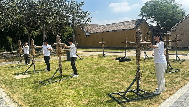 实践团成员们移步至当年人民战士操练所用的训练场,亲身体验革命先辈们的日常训练。