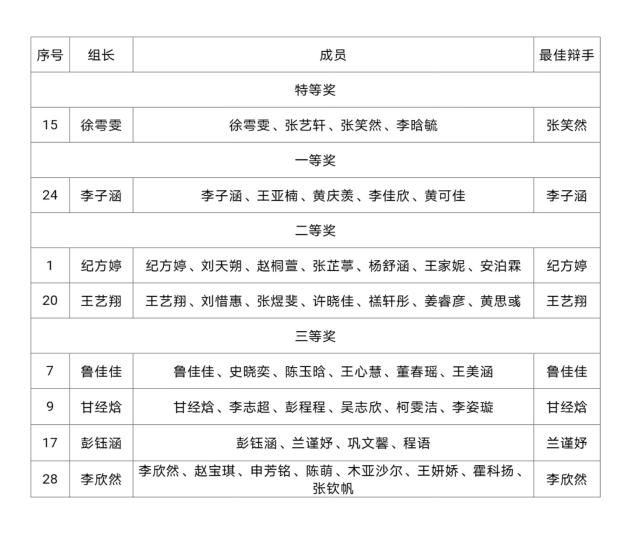 经评审,本次大赛共选出特等奖1组、一等奖1组、2等奖2组、3等奖4组,最佳辩手8名。