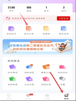 (2)二课学分查询流程:登录到梦空间之后,可以点击屏幕下方“我的”界面可查看二课学分及成长记录。
