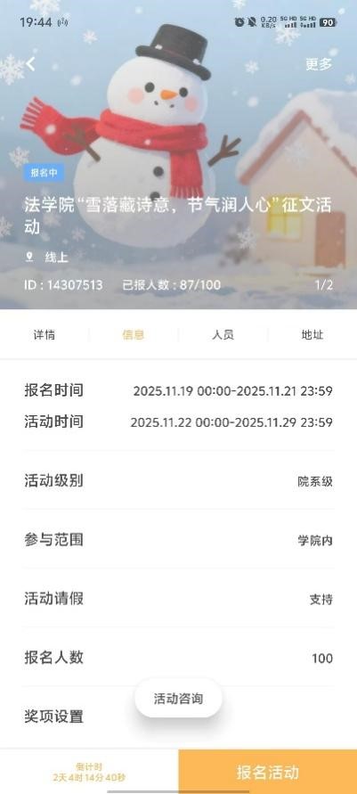 (1)活动报名流程:点击屏幕下方“本校”界面可选择或搜索活动报名,也可点击校内专题,选择伟德victor1946网站专题。注意有些活动需要进群进行下一步任务,可以滑动选择第二页图片加群。(活动学分一般在活动结束后发放,报名但不参加活动会被系统惩罚)