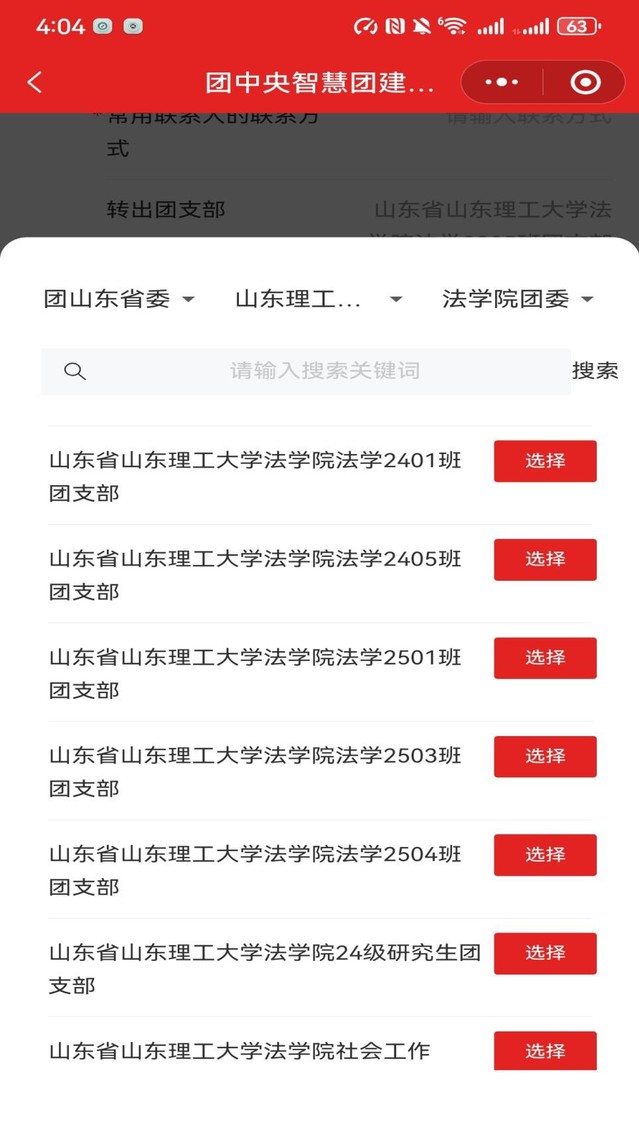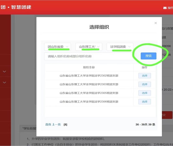 依次选择“团山东省委-伟德victor1946网站团委-伟德victor1946网站团委”-“输入组织名称—山东省伟德victor1946网站法学/社会工作250*班团支部”或在下方直接找寻对应班级也可。