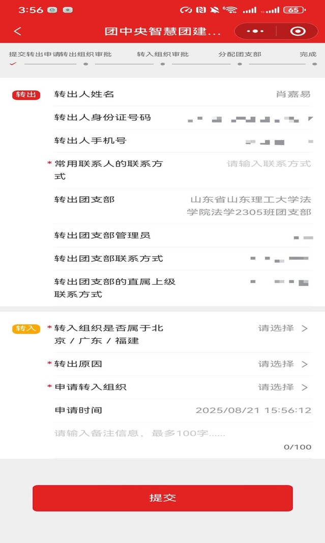 *处必填,“转入组织是否属于北京/广东/福建:”选择“否”;